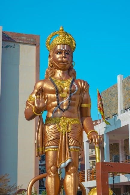 The Sankatmochan Hanuman Ashtak was composed by the revered poet-saint Tulsidas, a devoted follower of Lord Hanuman. Drawing inspiration from the Ramayana, Tulsidas crafted this hymn to glorify Hanuman’s divine qualities and his role as a savior. Historically, the Ashtak has been a cornerstone of Hindu devotion, particularly in North India, where Tulsidas’s works are deeply cherished. Its composition is believed to have occurred during a period of widespread turmoil, making it a timeless prayer for relief from adversity. Over centuries, the hymn has been passed down through generations, with its PDF versions now widely accessible, ensuring its enduring presence in modern spiritual practices.
