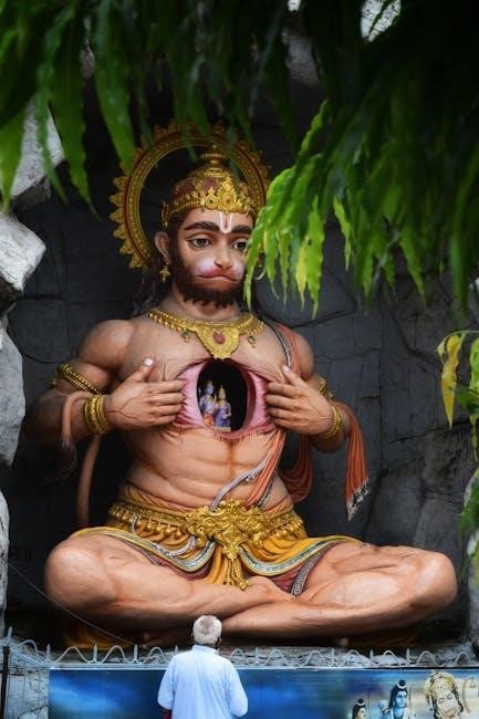 The Sankatmochan Hanuman Ashtak holds immense devotional significance in Hinduism, being a revered prayer dedicated to Lord Hanuman. It is widely recited by devotees to seek blessings, strength, and relief from adversity. The hymn embodies the essence of bhakti, emphasizing devotion, surrender, and faith in the divine. Its recitation is believed to invoke Hanuman’s grace, offering protection, courage, and wisdom. In Hindu spiritual practices, it is often chanted during puja ceremonies, festivals, and personal worship, fostering a deep connection with the divine. The Ashtak’s devotional significance lies in its ability to inspire humility, resilience, and unwavering faith, making it a cherished part of Hindu religious and cultural heritage.